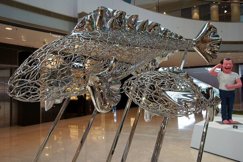 圖一的作品為「莫一新」的《悠閒假期》部份展品,內容大意是指北極熊無奈地望著腳下冰塊不斷溶化,漸無容身之所。作品利用不繡鋼鏡面作浮冰,以反映地球暖化問題。